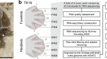 Embryos were dissected, or wings transversely sectioned with a razor blade and fixed overnight in 4% paraformaldehyde at 4 °C. Embryos were dehydrated and rehydrated through a methanol series, washed in PBS, then treated with proteinase K for 20 min (10 μg ml−1) washed in PBS, fixed for 30 min in 4% PFA and then prehybridized at 65 °C for 2 h (50% formamide/50% 2× SSC). One μg of antisense mRNA probes for Shh and Gfp were added to 1 ml of hybridization buffer (50% formamide/50% 2× SSC) at 65 °C overnight. Embryos were washed in hybridization buffer (minus mRNA probes) and then in maleic acid buffer (MAB) buffer, before being transferred to blocking buffer (2% blocking reagent, 20% lamb serum in MAB buffer) for 2 h at room temperature. Embryos were transferred to blocking buffer containing anti-digoxigenin antibody (1/2,000) at 4 °C overnight, then washed in MAB buffer before being transferred to NTM (NaCl, Tris, MgCl2) buffer containing nitro-blue tetrazolium/5-bromo-4-chloro-3-indolyl phosphate and mRNA distribution visualized.
