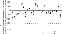 lacZ(PTC), sec-23p::gfp::lacZ(PTC), an NMD reporter15, was used for analysing changes in NMD activity. lacZ(WT), sec-23p::gfp::lacZ was used as a normalization control. Transgenic worms anaesthetized by using 100 mM sodium azide (DAEJUNG) were placed on a 2% agarose pad. Bright field and FITC filter images of the transgenic animals were captured by using an AxioCam HRc CCD digital camera (Zeiss Corporation, Jena, Germany) with a Zeiss Axio Scope A1 compound microscope (Zeiss). The head parts of worms were used for quantification due to high levels of autofluorescence in the intestine of aged worms. The GFP intensity was normalized by subtracting the autofluorescence intensity values of age- and genotype-matched non-transgenic control animals. Quantitative analysis for the fluorescence levels was performed by using ImageJ (Java-based image processing programme, National Institutes of Health, http://rsbweb.nih.gov/ij). The represented images in Fig. 1b and Supplementary Fig. 1b were captured using the Nikon A1si/Ni-E upright confocal microscope with × 60, 1.4 NA oil-immersion objective lens. Confocal microscopy data were acquired in the Advanced Neural Imaging Center in Korea Brain Research Institute. Images of tissue-specific NMD reporters were obtained with the same method that was used for capturing the images of ubiquitous promoter-driven lacZ(PTC) animals with minor modifications. For RNAi-treated conditions, worms were treated with corresponding RNAi for one generation (Supplementary Fig. 1c,d) or two generations (Fig. 3a). The images of Day 1 adult worms were then captured. For tissue-specific NMD reporters, fluorescence levels of age-matched CF1290 that expressed only the rol-6D coinjection marker were subtracted to normalize an age-dependent increase in autofluorescence. For an intestine-specific NMD reporter, the anterior part of the intestine was quantified for the analysis.