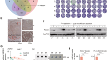 For in vitro tumour sphere-forming assay, 5000 cells were seeded in the ultra-low attachment 6-well plate (Corning Life Science) and cultured in tumour sphere-forming medium (DME/F12 supplemented with 5 μg ml−1 Insulin, 0.05 μg ml−1 human epidermal growth factor (hEGF) and 0.5 μg ml−1 Hydrocortisone). Cells were incubated at 37 °C for 13 days and spheres larger than 100 μm were counted. For in vivo tumour engraftment assay, cancer cells were first stained using ALDEFLUOR Kit (StemCell Technology) following the manufacturer’s manual. Cells with top 2.5% Aldh enzymatic activity were then isolated by cell sorting using flow cytometry. One thousand isolated cells were subcutaneously injected into each nude mouse (NCRNU-F/Homozygous, Taconic Farms, 5-week-old, total 54 mice were used) and monitored for tumour growth for 70 days. Mice died tumour free were excluded from the final results. No statistical method was used to predetermine the sample size. No specific randomization method was used. The person who performed the subcutaneous injection is blinded to the group allocation of cancer cell line. All animal experiments were performed under Institutional Animal Care and Use Committee approval protocol.