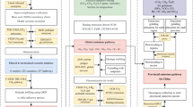 The model calculates projected CO2 emissions based on representations of carbon emissions from the energy and land-use change sectors, as discussed above. These emissions accumulate in the atmosphere until they are absorbed into the biosphere, pedosphere or oceans based on C-ROADS, a Simple Climate Model, which has been used extensively for climate policy impact analysis and decision making by parties to the UNFCCC34,35. Pathways and simplified equations for gross carbon flux among the reservoirs are illustrated in Fig. 7 and discussed below28.