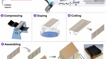 The electrical conductivity and Seebeck coefficient in this study were measured in air at room temperature (1 atm, 25–27 °C, relative humidity: 40±3% RH) by a homemade testing stage using the four-electrode method and steady-state method. The in-plane thermal conductivity measurement of CNT films was performed through a developed self-heating method using the homemade measuring apparatus, whose details and results were shown in Supplementary Note 1, Supplementary Fig. 5 and Supplementary Table 3. More details of the measuring apparatus and method can be also found in our recent study55. The resistance and voltage were measured using a Keithley 2400 multimetre, and the whole system was controlled by a computer through LabVIEW programmes. The TE performance (including the voltage–current curve and power–current curve) of the as-prepared flexible module fixed on the testing stage at the various steady-state temperature gradient were tested by a Keithley 4200-SCS.