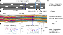 The computational model of the collagen triple helix molecule represented type I collagen from Mus musculus with the sequence encoded as GEV GPO GPO GPA GEK GSO GAD GPA GSO GTO, which is close to the location of the known intermolecular covalent crosslink at position 930 (ref. 49). The N-terminus was acetylated and C-terminus was capped with N-methylamide to remove charges. The molecule was equilibrated in a water solution of 0.1 mol l−1 NaCl and the ratio between cations and anions was chosen for neutral system charge. Periodic boundary conditions were applied to all directions, and the system size was maintained at 18 × 5 × 5 nm to keep the minimum distance between mirroring images larger than the cutoff distance. Each simulation was performed in the isothermal–isobaric ensemble (normal temperature and pressure (NPT), constant pressure of 1 atm and constant temperature of 310 K) by using LAMMPS open-source code with interatomic interactions defined by the CHARMM22 force field for proteins and solvent. The simulation time step was 2 fs using a rigid bonds model for all of the covalent bonds between hydrogen atoms and other heavy atoms. Energy minimization and equilibrium simulation was performed for 22 ns for a fully equilibrated structure before mechanical test. A particle mesh Ewald function was used with a grid width <1 Å to calculate the electronic interactions. The steered MD method was used to deform the molecule with a constant loading speed at 0.002 Å ps−1. The triple helix collagen molecule was deformed by fixing one alpha carbon atom at the N-terminus of one chain and tensile force is applied to an alpha carbon atom at the C-terminus of another chain. After a certain amount of tensile strain, the structure was taken out and allowed to stress relax for 40 ns. SASA was computed during the last 20 ns of the relaxation simulation using the VMD Molecular Graphics Viewer69 with a probe radius of 1.4 Å. We examined additional boundary conditions for the N and C-terminus ends of the triple helix as well as a more thermally stable molecular sequence [(GPO)6(GPA)2(GPO)2], and the results of these simulations are detailed in Supplementary Figs 8–10 and Supplementary Table 1.