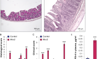 For each animal, histological examination was performed on the colon; samples were fixed in 10% formalin before staining with H&E. All histological quantitation was performed blinded using a scoring system as described56,57,61. The three independent parameters measured were severity of inflammation (0–3: none, slight, moderate, severe), extent of injury (0–3: none, mucosal, mucosal and submucosal, transmural) and crypt damage (0–4:none, basal one-third damaged, basal two-thirds damaged, only surface epithelium intact, entire crypt and epithelium lost). The score of each parameter was multiplied by a factor reflecting the percentage of tissue involvement (× 1, 0%–25%; × 2, 26%–50%; × 3, 51%–75%; × 4, 76%–100%) and all numbers were summed. The maximum possible score was 40.