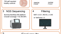 The GATA4 knockout mouse is embryonically lethal between embryonic day (E) 7.0 and E9.5, and lacks a primitive heart tube28. Deletions of GATA4 in humans have been associated with congenital heart defects (CHDs)30,31, and a missense variant p.Gly296Ser was identified in a family with atrial and ventricular septal defects32. A mouse model of the p.Gly296Ser missense change is also embryonically lethal by E11.5, but a subset of these mice demonstrate semilunar valve stenosis and small defects of the atrial septum, thought to be resultant from defects in cardiomyocyte proliferation during embryogenesis33. Previous studies observed missense variants in GATA4 in patients with septal defects34, CHDs35 and Tetralogy of Fallot (ToF)35, but have not been tested in case–control models. The frequency of GATA4 variants in healthy controls is not clear from these studies and their pathogenicity is unknown. The co-appearance of congenital heart disease and testicular anomalies was found in a family with a GATA4 p.Gly221Arg mutation, thought to disrupt interaction with FOG2 and/or NR5A1, important factors for gonadal development36. GATA5 has 46% homology with GATA4. GATA5 sequence variants have been identified in humans with BAV37,38, and GATA5 knockout mice and zebrafish demonstrate high rates of cardiac abnormalities39.