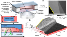 The findings presented above differ fundamentally from the results of previous AFM studies on the crystallization of both ionic minerals and proteins. The classical scenario of mineral growth assumes that new layers are initiated by the direct formation of crystalline 2D nuclei18. Such a ‘birth and spread’ pathway has been evidenced for the growth of calcite43 and other minerals. In turn, 3D nuclei in protein crystallization—which are assumed to originate from liquid–liquid demixing9—transform directly into crystalline multilayers with heights similar to that of the initial precursor7, rather than spreading out into one single layer as observed in the present work. The data in Fig. 2 indicate that crystallinity emerges only during the decrease in height as amorphous 3D nanoscopic entities transform into crystalline 2D layers12. In the present case, we hypothesize that the release of water from hydrated disordered precursors back into the surrounding solution is entropically favourable, and thus drives the assembly of remaining solute molecules into an ordered structure on the underlying parent crystal substrate44.