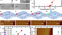 To further confirm the existence of nanoscopic entities in solution, we conducted an in situ AFM experiment using silicon wafers as an inert substrate. In this case, two populations of nanosized species were observed at the surface (Fig. 1c,d and Supplementary Fig. 4). On the one hand, we detected very small clusters (marked by arrows in Fig. 1c) that attached transiently to the surface and had disappeared already in the next frame of the same area. Their measured height of ca. 1 nm is commensurate with the smaller populations detected by ESI-MS and AUC, and agrees with the size reported for PNCs of both ionic minerals3 and amino acids35 in the literature. Whether the fast disappearance of these species is due to Brownian motion, dissociation into small fragments or coalescence into larger entities cannot be inferred from the present data. On the other hand, we also observed distinctly larger structures, initially ∼2–4 nm high and 150–300 nm wide, attaching to the silicon surface (Fig. 1c,d and Supplementary Fig. 4a) and decreasing in height with time (see Supplementary Fig. 4b). These species may correspond to the mesoscopic aggregates reported in the literature and are clearly too large to be detected by AUC and ESI-MS.