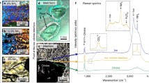 Raman analyses were performed using a JY Horiba LabRam HR (800 mm) spectrometer, 600 grooves per mm grating, slit width of 150 μm and the confocal aperture was set at 100 μm. A 514.529 nm (green) Laser Physics 100S-514 Ar+ laser was used with a 50 mW output power at the source and ∼10 mW at the sample, focused through either a × 40 or × 100 objective, and an electronically cooled open electrode 1,024 × 256 pixel CCD (charge-coupled device) detector. Raman X–Y mapping was conducted using a JY Horiba LabRam HR confocal Raman spectrometer with a 473 nm laser source and a 600 grooves per mm grating and a 100 μm confocal aperture and × 100 objective.