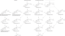 Triterpenoids are one of the major groups of therapeutic compounds in G. lucidum, from which more than 150 triterpenoids have been isolated. We observed differences in triterpenoid profiles at different developmental stages. The triterpenoid content was extremely low in cultured mycelia but was markedly increased in the primordia, and it was then clearly reduced during fruiting body formation (Fig. 2d). Triterpenoids are synthesized via the mevalonic acid pathway in G. lucidum13 (Supplementary Fig. S5). The pathway upstream of the cyclization step includes 11 enzymes encoded by 13 genes in G. lucidum. Acetyl-CoA C-acetyltransferases and farnesyl diphosphate synthases are each encoded by two genes in the G. lucidum genome, whereas the remaining nine enzymes are encoded by single-copy genes (Supplementary Table S8). Lanosterol is synthesized by lanosterol synthase (LSS), and it is the common cyclic intermediate of triterpenoids and ergosterol in G. lucidum, from which different metabolic pathways diverge14. The steps following cyclization are largely unknown but most likely include a series of oxidation, reduction and acylation reactions. Among these reactions, oxidations catalysed by proteins of the cytochrome P450 superfamily (CYPs) have significant roles in the modification of the lanosterol skeleton (Supplementary Fig. S5).