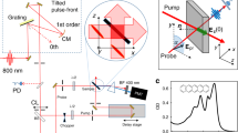 Figure 4 provides a schematic of the experimental setup used to acquire momentum-resolved BFP images and spectra. In both cases, the samples were illuminated in an inverted microscope (Nikon TE2000) through an oil immersion objective (Plan Fluor 100×/1.3 NA) by continuous wave lasers focused to a near diffraction limited spot size (~400 nm). A solid-state 532-nm laser (Coherent Verdi) was used to excite Eu3+:Y2O3, whereas the 488-nm line of an argon ion laser (Coherent Innova) was used to excite Tb3+:Y2O3. For both materials, emission patterns were observed to be independent of excitation polarization, and thus for consistency, all data presented here were acquired with p-polarized linear excitation (that is, with the polarization axis of the excitation source aligned along the slit direction). To acquire two-dimensional momentum images, the BFP of the objective was directly imaged using a Bertrand lens onto a CCD camera (Princeton Instruments Pixis 1024B). To acquire energy- and momentum-resolved spectra, the objective's BFP was imaged onto the entrance slit of an imaging spectrograph (Princeton Instruments SP2300i). After dispersion by a diffraction grating (300 lines mm−1 blazed at 500 nm), the resulting BFP spectra were measured using a CCD camera (Princeton Instruments Pixis 1024B). An intensity-calibrated light source (Princeton Instruments IntensiCal) was used to record the frequency response of the experimental setup, including objective, filters and spectrograph, to within a constant factor. All data are presented and analysed in units of calibrated counts, which have been corrected for the setup's spectral response using 650 nm as a reference point for the constant factor. The integration time used to acquire the experimental data presented in Fig. 1b was 5 s, Fig. 2a,b was 10 s, Fig. 3b was 100 s, Fig. 3c was 600 s and Supplementary Fig. S4a,b was 15 s.