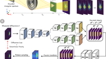 The diffraction pattern in Fig. 4b was used to solve the phase problem and reconstruct the sample electron density. In cylindrical coordinates, the azimuthal projections of the sample electron density and scattering amplitude are related by a Fourier transform in the direction of cylindrical symmetry axis and a zeroth-order Hankel transform in the radial direction19. While the 2D Fourier transform results in the projection of sample electron density in the direction of X-ray beam, this transform provides more information on the sample electron density by revealing the interior of the particle. For a sample with cylindrical symmetry, it is equivalent to a 3D Fourier transform of diffraction volume, and greatly reduces computation time. Image of the electron density averaged over 5,000 reconstructions with different starting points after their longitudinal alignment is shown in the inset of Fig. 4b. Full-period resolution is 20 nm, twice the pixel size, and limited by the maximum measured scattering vectors.