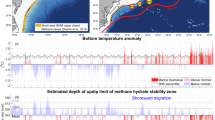 The predominance of CO2 in the discharged gas and the extensive occurrence of flares in both of the basins has acidified 20–50 m of sea water near the bottom of the entire area (>2,000 km2) to values within 7.55–7.98 pHT units (Fig. 4; Supplementary Table S2). Similar phenomena of extensive sea water acidification generated by CO2 discharged by hydrothermal venting have not been reported. However, local acidification was observed in three sites31,32,33, namely, the Okinawa Trough, Japan (lowest pH=6.97 at 1,428 m depth), in Ischia, Italy (lowest pH=6.40 at 3 m depth), and in Papua New Guinea (lowest pH=7.21 at 3 m depth). CO2 venting in those areas is related to the presence of marine deep- and shallow-water hydrothermal systems. The average value of 7.77 units, as found in the present study, is similar to the extrapolated pH level of the shallow ocean water at the end of this century due to the increase in atmospheric CO2 concentrations34. The extensive acidification of the bottom water predominates over the mixing effect of strong currents and makes this area a natural laboratory for the study of the effects of long-term acidification on deep-water ecosystems.