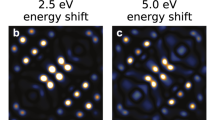 We can understand these data by considering the bound-state probability distributions of the DB potential well(s). The localized protrusions in Fig. 3b–d are all in agreement with the ground-state probability density of a radially symmetric potential well or linear combinations of such states. However, this is not true of the three-lobed feature seen in Fig. 3g; here the maximum in the bound-state intensity occurring at the midpoint between the two missing H atoms requires a contribution from a higher-energy bound state. We confirm this by creating a model potential30 for the single DB that supports two bound states: a ground state near the valence band maximum, consistent with the electron paramagnetic resonance data13 and our density functional theory calculations (that are presented in Supplementary Note S2, Supplementary Table S1 and Supplementary Fig. S2), and a first excited state near the conduction band maximum, as shown in Fig. 3e. Bound-state wavefunctions and energies are obtained via a piecewise continuous solution of the Schrödinger equation (see Methods for further details). When coupled to a second identical well 0.77 nm away, the ground state splits into symmetric and anti-symmetric combinations separated by ~0.2 eV (Fig. 3j). As expected, the probability distributions of the states for the single and double-DB wells (blue and green traces in Fig. 3e) are in good agreement with the STM images in Fig. 3b–d. The wavefunction overlap of the single-well excited state leads to a new state with a probability density maximum located at the midpoint between the two DB sites, and two outer protrusions of lower intensity separated by 1.3 nm (red trace in Fig. 3j), closely resembling the feature we see in the experimental STM data in Fig. 3g. This state can be considered as an excited molecular orbital of the double-DB system. However, we will refer to this state in the following as the low binding energy (LBE) state to avoid ambiguity regarding the electron occupancy of the states. The LBE state is imaged only under certain conditions because of the alignment between the surface and tip energy bands, which is determined by the gating effect of the tip on the substrate. Figure 2c shows an energy-band diagram for imaging the double DB in empty states, which is similar to Fig. 2b but explicitly includes all three of the double-DB bound states (compared with Fig. 3j). The tip EF is drawn with two different alignments to the surface bands. When aligned as in configuration 1, the electrons cannot access the LBE state; the image is then dominated by tunnelling into the conduction band through a small tip-induced depletion region, and transport through the two lower-lying bound states. However, if the tip EF is as shown in configuration 2, then resonant tunnelling through the LBE state will dominate the image. The change in band alignment can be induced by changing the STM tip bias as shown in Fig. 2c, or by changing the tunnelling current set point, which changes the tip-sample separation and, hence, the band bending in the substrate (Fig. 2d). Altering the current also changes the rate of charge transfer to the DB, inducing additional changes to the band alignment and enhancing the effect illustrated in Fig. 2d. In the data shown in Fig. 3g, we have changed the tunnelling current from 5 to 95 pA, such that these images correspond to the solid and dashed lines, respectively, in Fig. 2d.