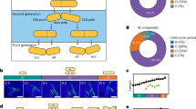 In contrast to the canonical organization of the cell division cycle as discrete and non-overlapping B, C and D periods25 (Fig. 6a), we find that the B period is unusually short or absent in single cells of M. smegmatis (Supplementary Fig. S6a and Supplementary Table S1). Thus, in the majority of single cells, the D period of the cell division cycle in the mother cell overlaps with the C period of the division cycle in the next-generation daughter cells (Fig. 6b). In our experiments, initiation of DNA replication in the mother cell before cytokinesis cannot be attributed to multifork replication26,27,28 because we never observe a new round of DNA replication to initiate until the previous round has finished.