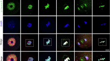 For immunostaining, cells were cultured directly on glass coverslips, washed with PBS, fixed in 4% paraformaldehyde and then incubated with the indicated primary and secondary antibodies. For chromosome spreading assays, cells were treated with 100 ng ml−1 colcemid or 200 ng ml−1 nocodazole for 4 h and mitotic cells were collected using the shaking-off method. Mitotic cells (2 × 105 ml−1) were incubated in a hypotonic buffer (50 mM Tris (pH 7.4) and 55 mM KCl), fixed with freshly made Carnoy’s solution (75% methanol and 25% acetic acid), dropped onto glass slides, and dried at 37 °C. Slides were stained with 5% Giemsa (Merck), washed with PBS, air-dried and processed for fluorescence microscopy. For chromosome-arm-Specific FISH, cells were collected by trypsinization, swollen in a hypotonic buffer (50 mM Tris (pH 7.4) and 55 mM KCl) for 20 m at 37 °C and then fixed twice with Carnoy’s solution (75% methanol and 25% acetic acid) for 15 min. The fixed cells were spun onto glass slides using Shandon Cytospin at 1,500 r.p.m. for 5 min, rehydrated in 2X SSC at 37 °C for 30 min and dehydrated in an ethanol series of 70, 85 and 100% for 2 min each. The samples were denatured in 70% formamide/2 × SSC at 72 °C for 5 min and dehydrated in 70, 85 and 100% ethanol for 2 min each. The samples were hybridized to Cy3-conjugated probes specific to chromosome arm regions (on chromosome 7 and 21), incubated with primary (BrdU) and secondary antibodies (Alexa 568, 1: 300; Molecular Probes) and then stained with DAPI solution. Images were acquired on a LSM510 META confocal microscope fitted with a × 20 NA 0.75 objective lens (Carl Zeiss) and an AxioCam camera (Carl Zeiss). Z series of 0.3 μm stacks were acquired using AxioVision Release 3.x software with Z stack module and deconvolution was performed using Huygens software (Scientific Volume Imaging). The distance between paired FISH signals was measured on the projected images using Huygens software (Scientific Volume Imaging), and the significance of the differences in distance was examined by the statistical Student’s t-test.
