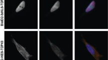 The cells were plated on cover slips. Treated or untreated cells were fixed with 3.7% paraformaldehyde in phosphate-buffered saline at room temperature (RT) for 10 min, according to an immunostaining protocol33. The fixed cells were incubated with an antibody against TDP-43 (1:500 dilution) or TIAR (610352, 1:500 dilution) (BD) at 4 °C overnight followed by an incubation with a secondary antibody conjugated to a fluorescent dye at RT for 1 h. The cover slips were mounted with mounting medium (Sigma-Aldrich), and the fluorescent images were acquired with a fluorescent microscope (IX71; Olympus, Center Valley, PA, USA) or a laser confocal microscope (LSM710 META or LSM510 META NLO; Zeiss, Thornwood, NY, USA).
