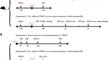 All animal procedures were approved by the Animal Care and Use Committee of Renmin Hospital of Wuhan University. Animal experiments were performed in accordance with the National Institutes of Health Guide for the Care and Use of Laboratory Animals (NIH Publication No. 80-23 revised in 1996). C57BL/6 TRAF1-KO mice were purchased from Jackson Laboratory (Bar Harbor, ME, USA; Stock No. 008076), and the mice were genotyped using PCR analysis with the primers 5′-GCCAGAGGCCACTTGTGTAG-3′, 5′-CAGAACCCCTTGCCTAATCC-3′ and 5′-TCCTAGAGGCCTGCTGCTAA-3′. To generate TRAF1 transgenic mice, we cloned full-length murine TRAF1 cDNA downstream of the neuron-specific promoter platelet-derived growth factor as a 1229-bp XhoI-BamHI fragment using amplification with the primers 5′-GAACTCGAGCCACCATGGCCTCCAGCTCAGCCCC-3′ (forward) and 5′-GAAGGATCCTAAGCACTAGTGTCCACAA-3′ (reverse). This construct drives the preferential expression of TRAF1 in neurons. Transgenic mice were produced by microinjecting the construct into fertilized embryos (C57BL/6 background), and four independent transgenic lines were established. PCR analysis of tail genomic DNA was performed using the primers 5′-AAGGGTGGCAACTTCTCCTC-3′ (forward) and 5′-ATAAGGAATGGACAGCAGGG-3′ (reverse) to genotype the mice. Only 11–12-week-old (25–30 g) males were used. All mice were housed in an environment with controlled light (12 h light/dark), temperature and humidity, with food and water available ad libitum.
