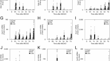 Focal cerebral ischaemia was induced by occluding the left MCA using the intraluminal filament technique42,43,44. Briefly, the mice were anesthetized with 2.5–3% isoflurane in O2. The rectal temperature was maintained at 37±0.5 °C using a homoeothermic blanket. rCBF was measured using a laser-Doppler flowmetry instrument (Periflux System 5010; Perimed, Järfälla, Sweden) with a flexible probe affixed to the skull (2 mm posterior and 5 mm lateral to the bregma). To achieve tMCAO, a 6-0 silicon-coated monofilament surgical suture (Doccol, Redland, CA, USA) was inserted into the left external carotid artery, advanced into the internal carotid artery and wedged into the cerebral arterial circle to obstruct the origin of the MCA. A decline in rCBF >75% confirmed the interruption of blood flow in the MCA. Sixty minutes after MCAO induction, the filament was withdrawn, and a return to >70% of basal cerebral blood flow within 10 min of suture withdrawal confirmed reperfusion of the MCA territory. The mice underwent reperfusion for the durations indicated in the text. The mice in which the filament was withdrawn immediately after the decline in rCBF were used as sham controls. Heart rate, systolic blood pressure and diastolic blood pressure were monitored in randomly selected, conscious mice using the non-invasive tail-cuff method. We measured body weight and arterial blood gases before surgery.