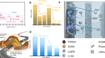 At first glance, hybrid anode in its current form (Fig. 1) may affect the energy density of the whole cell, as it incorporates additional accessory weights. However, it was found that the ratio between sulphur and graphite also directly influences the cycling stability (Supplementary Fig. S4). That is, the higher the S/LiC6 ratio (thinner graphite), the more stable the cycling. In other words, to fully utilize the hybrid concept, the weight of graphite needs to be minimized while the sulphur loading has to be maximized. The weight burden from graphite is therefore largely reduced. Neither gravimetric nor volumetric energy densities of the whole Li–S battery adopting the hybrid anode will be influenced significantly.