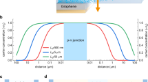I–V measurements to characterize the electrical behaviours of graphene p–n PDs were carried out using a Keithley 2,400 source meter controlled by a LabView program. The DC noise under forward bias was measured with a dynamic signal analyser (Agilent 35670A) coupled to a low-noise current preamplifier (Stanford Research SR570) in the frequency range of 1 Hz~5 kHz. During the measurements, the PDs were mounted in a dark, electrically shielded and optically sealed chamber on the optical table to reduce vibrational noise. The spectral photoresponse was detected in the 300–1,100 nm wavelength range. For this purpose, we used a 450-W xenon light source and a 0.25-m grating monochromator (Newport Cornerstone 260 1/4 m monochromator). The incident light intensity was monitored by a motorized variable wheel attenuator and a Newport calibrated UV-enhanced silicon photodiode. The power density of the incident light on the sample surface was about 1~320 μW cm−2 depending on the wavelength in the range of 300~1,100 nm. A 532-nm monochromatic light from a diode laser was used for studying the photosensitivity linearity with light power. The light was modulated with a mechanical chopper (Stanford Research Systems) at 30 Hz, and the PC response at various bias voltages was recorded with a Signal Recovery 7,265 DSP lock-in amplifier. Optical neutral density filters were used to vary the light intensity from nW up to 7.2 mW. (maximum power: 90 mW). For frequency dependence of the PC, the graphene p–n PD was illuminated by a Thorlabs 50 μW, 530 nm light-emitting diode array with an Instek SFG-830 30 MHz function generator used to supply a constant or modulated bias to the light-emitting diodes. The PC response was measured with an SR530 lock-in amplifier coupled to a current preamplifier (Stanford Research SR570) in the frequency range of 1–100 kHz. Transient PC studies were conducted using laser pulses from the Nd:YAG laser (532 nm wavelength, 20 ps duration and 20 Hz repetition rate, generated by a Continuum Leopard-D20 Nd:YAG laser), which were focused onto the PD devices with a spot size of ~5 × 5 mm2. A laser power meter (Laser probe, Rj-760) was used to measure the average power of the laser pulses. The laser pulse temporal profiles and transient PC were monitored with the 50 ohm terminated, 500 MHz bandwidth digital oscilloscope (Tektronix DPO 4054). All measurements were performed in a dark, shielded enclosure under vacuum at RT.