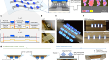 A 10:1 wt ratio mixture of PDMS and its curing agent was spin-coated onto a glass slide (25 × 75 × 1.0 mm3, Fisherbrand) for 10 s at 500 r.p.m., then 45 s at 3,500 r.p.m., leading to a 25 μm-thick PDMS thin film. Then the PDMS thin film was placed on a 100 °C hot plate under the micro-manipulator and pre-baked for 140 s. During the pre-bake, we lowered the microsphere array towards the PDMS thin film until they got separated by 50 μm. Upon completion of the pre-bake, we further lowered the microsphere array to make it physically contact the PDMS thin film. After 40 s of contact, we lifted the micro-manipulator at a speed of 144 μm s−1 to directly draw PDMS micropillars. To solidify the micropillars formed between the microsphere array and the PDMS thin film completely, we post-baked it for 2 h at 100 °C and for 24 h at room temperature. Then, we manually detached the double-stick tape from the microspheres, completing the realization of the microsphere-micropillar complex.