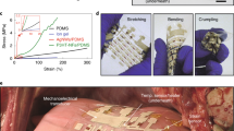 In addition to electrical and chemical evaluation, mechanical characteristics can be determined. Here strain sensors based on piezoresistive effects in nanomembranes of Si allow monitoring of the mechanics of contractions of the heart during a variety of propagation states. Careful mechanical design of the serpentine interconnect structures allows accurate measurement in spite of the fact that typical epicardial strains26 greatly exceed the fracture threshold of Si, as described in previously reported small-scale 2D devices15. In the present design, the 3D-MIM strain sensors include three p-doped Si piezoresistors in a rosette configuration (Supplementary Fig. 10). Two of the piezoresistors, with longitudinal axes perpendicular to each other, are aligned to the 110