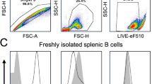 DLNs from immunized mice were digested with 250 μg ml−1 collagenase B (Roche) and 30 U ml−1 Dnase I (EMD) for 40–60 min at 37 °C with stirring in Iscove’s modified Dulbecco’s media containing 10% FCS, L-glutamine, sodium pyruvate, non-essential amino acids, penicillin/streptomycin and 2-mercaptoethanol (cIMDM). EDTA (5 mM final) was added and cells were incubated on ice for 5 min. Cells were passed through a 70-μm strainer before cell counting with trypan blue. Spleens were mashed between frosted glass slides and made into a single-cell suspension. Red blood cells were lysed with ACK lysis buffer. Cells were passed through a 70-μm strainer before cell counting with acetic acid.