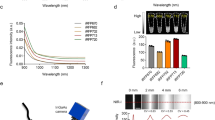 For characterization in mammalian cells, IFP1.4, IFP2.0, IFP2.0+HO1 and iRFP were cloned into pcDNA3.1 vector under CMV promoter. We also cloned GFP under internal ribosome entry site into the same vector. HEK293A cells were transfected using calcium phosphate transfection method and then imaged 48 h later on a Nikon eclipse Ti inverted epifluorescence microscope with red-shifted Cy5.5 filter set (665/45 nm exciter and 725/50 nm emitter, Chroma) and a digital CMOS camera, controlled by NIS-Element software (Nikon Instruments). Images were processed and analysed with ImageJ. The fluorescence intensity of IFPs was normalized by the fluorescence intensity of coexpressed GFP to accommodate variations in transfection efficiency among cells.