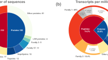 The predicted genes from the velvet spider were translated and the longest open-reading frame sequences were reported. Using the same strategy as for the tarantula, we assigned annotations of the protein sequences based on the NCBI non-redundant database. To specifically look for toxin sequences among the non-annotated sequences, these sequences were blasted against the Arachnoserver-araneomorphae toxin sequences, which fulfilled the criteria that they were smaller than 10,000 Da and containing >5 cysteines. The final velvet spider DNA sequences and the corresponding protein sequences can be found in Supplementary Data 5 and 6.
