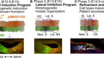 Protein extracts were prepared from E7 BPs treated with Bmp7 for 15 or 30 min at RT. Tissue was treated with RIPA buffer (SIGMA Aldrich) containing protease (Complete mini; Roche) and phosphatase (SIGMA Aldrich) inhibitor tablets at 4 °C. Tissue was left on ice for 2 h with periodic vortexing. Tissue lysates were subsequently denatured at 85 °C for 5 min with NuPAGE LDS sample loading buffer (Invitrogen) and β-mercaptoethanol (SIGMA Aldrich). Proteins were then separated using SDS–PAGE on a 4–12% gradient Bis-Tris gel (Invitrogen) and subsequently transferred to nitrocellulose membranes (Invitrogen) overnight at 4 °C. The primary antibodies and dilutions used were as follows: Rabbit anti-Tak1 (1:1,000, Cell Signaling), Rabbit anti-phospho-Tak1 (1:1,000, Cell Signaling), rabbit anti-Smad 1/5/8 (1:1,000, Cell Signaling), rabbit anti-phospho Smad 1/5/8 (1:1,000, Cell Signaling) and mouse anti-β-Actin (1:5,000, Sigma Aldrich). Horseradish peroxidase-conjugated anti-rabbit (1:1,000) or anti-mouse (1:5,000) IgGs were used as secondary antibodies (GE Healthcare). Specific bands were visualized by chemiluminescence using the SuperSignal West Pico Chemiluminescenct Substrate kit (Thermo Scientific).