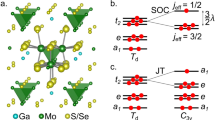 As a representative example of the lacunar spinels, we investigate the electronic structure of GaTa4Se8 (Fig. 1b–d). Figure 1b shows the band structure and the projected density of states (PDOS) of GaTa4Se8 in the absence of SOC. In consistency with previous studies21,22,23, the triply degenerate molecular t2 bands occupied by one electron are located near the Fermi level with a small bandwidth of ~0.75 eV. As shown in the PDOS plot, the molecular t2 bands are dominated by Ta t2g orbital components; the small admixture of Se 5p and the strong tetramerization imply that the molecular t2 states consist of direct bonding between Ta t2g states.