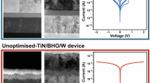 Figure 1b shows the I–V characteristics of the four Pt/Nb:SrTiO3 junctions. The I–V hysteresis was probed by sweeping from −6 V to +2 V, then back to −6 V. All samples show bipolar resistive switching, with a high positive bias increasing the junction current and negative bias reversing the effect. The device states are referred to as low- and high-resistance states (LRS and HRS). The HRS is identical to the initial state of the device if an appropriate switching protocol is chosen. The conductivity of the LRS can be tuned by modifying this protocol7. The magnitude of the resistive switching clearly decreases as the junction quality is improved (that is, from sample D to A).