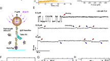 The images of TIRF fluorescence at 488 nm were taken for 1 min using Olympus IX71 (TIRF) microscope with a 1.45 numerical aperture, × 100 objective. Images were further analysed using in-house written Igor programme. Briefly, a region of interest containing a tethered magnetic bead was chosen and the total fluorescence intensity of this region of interest was recorded. The auto-fluorescence of the magnetic beads contributed to a background intensity, which was stable at our experimental time (~60 s) without any abrupt changes. For a tether with bound labelled VD1, photobleaching of single-dye molecules showed an abruptly decrease in fluorescence intensity, which allowed us to count the number of labelled VD1 associated to the tether.