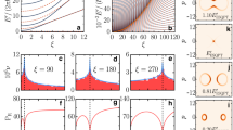 The experimental crossover from SO(4) to SU(4) dynamics is quantified by conducting a high-resolution measurement of the time-domain dynamics of the qudit population along the diagonal of the pq plane, sweeping the duration of the three-tone pulse in the range 1–200 ns (Fig. 3a). At lower amplitudes the excitation peaks of the |2› state behave as predicted by Pythagorean coupling theory. At higher amplitudes we observe a chevron pattern, which is readily understood in the Bell frame where SU(4) dynamics are mapped to single-qubit rotations with the addition of inter-qubit coupling. This coupling term changes the qubit resonance frequencies, thus affecting their respective detunings and Rabi oscillations. As the Bell-frame qubits are brought into resonance with their effective drives, their oscillation frequency decreases, manifesting as the chevron peak in the Lab-frame population.