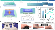 A PDMS layer (1 mm) was used as a supporting layer for a 1.4-μm-thick polyethylene terephthalate (PET) foil (Mylar 1.4 CW02, Pütz GMBH+Co.). Next, a thin film of Au (20 nm) was deposited on the PET film. The PET film was then placed in conformal contact with the gel strip, which was fixed on a glass substrate; the contact area was 1 cm2. Then, the film was pulled using a dynamic mechanical analyser instrument at a constant rate of 4 mm min−1 to measure the tangential shear stress (Supplementary Fig. 3a). A piece of commercial pork shoulder muscle was fixed on a glass substrate using double-sided adhesive tape. The gel patterned on the PET film was placed in conformal contact with the pig tissue; the contact area was 1 cm2. The film was then pulled at the same rate, that is, at 4 mm min−1. The surface of the pig tissue was kept sufficiently wet during the measurement to prevent it from drying.
