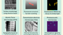 Spectrally resolved intensity maps were acquired for single stripes in a modified Leica DMRX optical microscope with a × 20 objective where an additional photoport allowed for the collection of the light reflected from the specimen into an optical fibre of 50-μm diameter. Spectra were collected from a spot of 2-μm diameter with a collection cone half angle of 33° and the corresponding maps were obtained by laterally scanning the sample in 2-μm steps while maintaining the specimen in constant focus. Quantitative spectral measurements for the determination of the stripes reflectivity in water were performed by using a × 63 water immersion objective with numerical aperture NA=1.0 allowing for the collection of spectra from spots of ~2-μm diameter over a polar angle range of 0–50°. Optical scattering of the samples was studied using a modified Olympus BXFM microscope, where by the incorporation of a Bertrand lens, scattering of a specimen under quasi-plane wave illumination, achieved via an additional photoport, was analysed by imaging the back focal plane of the objective. A high numerical aperture oil immersion objective (Leica PL APO 100 × /1.4 −0.7 OIL) was used to increase the observable angular range. The corresponding scattering angles for water as a medium above the shell surface were then calculated using Snell’s law. These are the angles displayed in Fig. 4c.