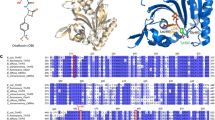 The two-step reaction of aminoacylation involves the binding of amino acid and activation of ATP, followed by a transfer of the activated amino acid to the 3′-OH of appropriate tRNA25. However, the polyketide structure of BN does not resemble any of the substrates of ThrRS. To understand the mechanism of inhibition of BN on ThrRS aminoacylation activity, we compared the ThrRS–BN structure with ThrRS structures in which one or more substrates are bound. With respect to L-Thr, BN’s location in the enzymatic centre of each ThrRS subunit (Fig. 2) creates a steric clash between the BN cyclopentanecarboxylic group (C18–23) and the amino-acid carboxyl group (Fig. 2b). Ten of eighteen BN-interacting residues are involved in the interactions with L-Thr during normal aminoacylation (Supplementary Figs 5 and 9), including two residues H590 and C413 that chelate the conserved zinc atom26 (Fig. 2b). In ThrRS complexes with bound L-Thr, these latter residues collaborate with H464 (which does not interact with BN) to chelate the essential zinc atom that recognizes the β-OH group of L-Thr27. BN also triggers side chain rearrangements that disrupts the L-Thr-binding site, stabilizing rotamer conformations of T560, Y540 and Q562 that would be incompatible with L-Thr binding (Supplementary Fig. 9). Co-crystallization of the ThrRS–BN complex in the presence of excess L-Thr (5 mM), ATP analogue AMPCPP (5 mM), and Mg2+ (10 mM) revealed density only for BN (2 mM) but not for L-Thr or AMPCPP. This suggests that L-Thr and BN cannot bind to ThrRS simultaneously (Supplementary Fig. 3c,d).