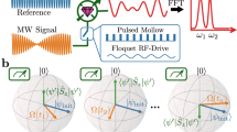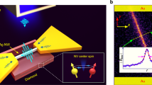 The probe head of the setup is shown in Fig. 1a. For the ease of demonstration, we use a chemical vapour deposition synthesized, type IIa diamond plate of 50 μm in thickness from Element Six, rather than a nanodiamond that contains NV centres as the magnetometer. The average distance between each NV centre is less than 100 nm, and there are ~20 NV centres in the laser spot. The static magnetic field B0 is aligned to the axis of each NV centre group to avoid ground-state mixing. The MW electronic circuits are designed to be 50 Ω impedance and the total power reflection is reduced to S11<−10 dB, so that a highly linearly polarized MW magnetic field is generated. As the relative permeability of diamond crystal is ~1.0000, the magnetic field inside the diamond should be the same as that outside of it. In our demonstration, we fix the applied static field to B0≈94.34 Gauss, and the corresponding frequency for the MW field is f=2.6000 GHz.