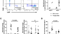 Bone marrow cells were isolated from C57BL/6 WT mice. 1 × 106 cells were stimulated for 5 min at 37 °C with PBS/0.1% BSA or soluble rmE-Selectin (CD62E Fc chimera, R&D Systems,1 μg ml−1). Rat IgG2b isotype control (eBioscience, 10 μg ml−1) or rat anti-mouse TLR4 antibody (1A6, NovImmune SA, 10 μg ml−1) were co-incubated with tubes containing soluble rmE-selectin. Cells were fixed using BD FACS Lysing solution (BD) and washed with PBS/5% BSA. Thereafter, cells were stained with polyclonal rabbit anti-mouse Mrp14 antibody (1.5 μg ml−1, Johannes Roth, University of Münster). Donkey anti-rabbit Alexa Flour 488 (Molecular Probes/Invitrogen, 2.5 μg ml−1) was used as secondary antibody. Rat anti-mouse Ly6G pacific blue (1A8, BioLegend, 1 μg ml−1) was used to define neutrophils. Amount of receptor-bound Mrp14 on Ly6G+/Mrp14+ cells was determined using a Beckman Coulter Gallios flow cytometer.