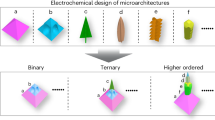 To investigate the versatility of SIRD, we electroplated devices using a number of different metal salts (Fig. 2). For comparison, each metal salt is kept at a 2 mM concentration with 50 mM of HCl as supporting electrolyte and the structures formed are compared across the same plating periods. We tested H2PtCl6 (Fig. 2a) to investigate whether SIRD would occur with a metal with slower-plating kinetics. We found that electroplating devices with platinum readily caused electrically shorted connections to be formed even with plating periods <5 min. We explain this by noting that H2PtCl6 has the tendency to deposit isotropically.