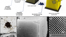 The preparation of Ag octahedra was carried out using the polyol reduction method35, starting first with the synthesis of Ag nanocubes. In a typical nanocube synthesis, 10 ml of CuCl2 (8 mg ml−1), PVP (20 mg ml−1) and AgNO3 (20 mg ml−1) were separately dissolved in 1,5-pentanediol (PD). 35 μl CuCl2 solution was added to the AgNO3 solution. 20 ml PD was then heated to 190 °C for 10 min. 250 μl PVP precursor was added to a round-bottom flask dropwise every 30 s, while 500 μl AgNO3 precursor was injected into the flask every minute in one go. The reaction was allowed to proceed for ∼20 min following which, the injection was continued using 30 ml of PVP (20 mg ml−1) and AgNO3 (40 mg ml−1 with 120 μl CuCl2). Both precursors were separately prepared in PD. The reaction was allowed to proceed until the precursors were used up. The Ag octahedra solution was redispersed in 20 ml ethanol after removing the PD via multiple centrifugation rounds, and diluted, then vacuum filtered multiple times using polyvinylidene difluoride filter membranes (Durapore) with pore sizes ranging from 5,000, 650, 450 to 220 nm to remove impurities before finally dispersing in ethanol. Following purification, the PVP-functionalized Ag octahedra were subjected to ligand exchange reactions to tailor their surface chemistry for subsequent self-assembly experiments.
