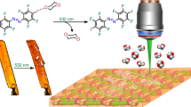 Single-crystal X-ray diffraction analyses were carried out to determine the molecular orientation and crystal faces. The observed crystal structure of DMAB was orthorhombic and was consistent with the literature56. The crystal faces of the parallelogram-shaped crystal were determined to be (1 0 0), (0 1 1) and (0 1 −1) for the top and side faces, respectively, as shown in Fig. 2g. The calculated angle between the two side faces ((0 1 1) and (0 1 −1)) is 56.02°, which is in good agreement with the measured angle (ca. 56°) of the crystal. The direction of the molecular orientation along the c axis (Fig. 2h) is in accordance with the polarizing optical microscopy observation that one of the optic axes is along the longer diagonal axis of the crystal.