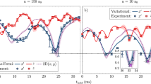 Grey data points show the fitted sinusoidal interference visibility, , where A and μ are the sinusoidal amplitude and mean number of counts. Error bars are the 1σ uncertainties extracted from the fit. The panels correspond to a laser power of (a) P=3.50 W, (b) P=3.75 W, (c) P=5.25 W, (d) P=5.75 W. The dotted blue line shows the quantum prediction of a pure phase grating. The dashed red line includes photon absorption as a random walk32. The solid black line shows our quantum model from equation (5), which includes the interplay of coherent absorption and phase modulation. Negative visibilities arise when the phase of the interference pattern of a given time bin is shifted by π with respect to the phase of the velocity averaged signal. This only occurs if some fraction of the ensemble absorbs an odd number of photons.