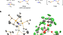 Phosphorus donor ligands provide opportunities for systematically modifying the properties of SMMs because their chemistry can be developed with neutral phosphines (R3P), mono-anionic phosphide (R2P−) and di-anionic phosphinidene (RP2−) ligands, as well as the tri-anionic phosphide ligand (P3−)19. Since electrostatic interactions strongly influence the electronic structure of lanthanides, the ability to synthesize compounds with similar molecular structures, but where the ligands carry different formal charges, could allow new ways of designing SMMs. Changing the organo-phosphorus ligand should also influence the exchange interactions in polymetallic systems, which is important because exchange is known to influence relaxation phenomena3,4,5. Phosphinidene complexes of the lanthanides are rare20,21,22,23,24,25, and, although their reactivity has been studied, their influence on 4f electronic structure has not. Indeed, phosphorus-ligated Ln-SMMs are unknown, hence we now target the SMM properties of dysprosium complexes with bridging phosphide and phosphinidene ligands. Here we show that organo-phosphorus chemistry can be used to influence the dynamic magnetic properties of lanthanide complexes; our observations have general implications for how main group organometallic chemistry can be used to develop new SMMs.