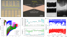 We used a voltage ramp (0 to 3 V or 0 to −0.4 V without return sweeps) to programme the device to the ON or OFF state. A current compliance (Ic) was set to minimize the possible damage to the device without affecting the nonvolatility (Fig. 2a). By applying a maximum sweep voltage of 3 V to the Ag terminal relative to the Au/Ti terminal, a 110-nm-wide continuous Ag filament formed within the 35-nm gap (Fig. 2b). On the other hand, a −0.4-V bias ruptured the filament, programming the device in the OFF state (Fig. 2c). Both the high and low-resistance states (OFF/ON) after programming were nonvolatile, as confirmed by probing with lower voltages (±100 mV). In addition, the ON/OFF conductance ratio of the device was nearly 1012—7 orders of magnitude higher than that of a phase-change material switch29—indicating extremely low current flow in the OFF state. We further discovered that the geometry of the continuous silver filament was dependent on the programing process (see Supplementary Fig. 3 and Supplementary Note 2). Under otherwise identical conditions, a higher current led to a filament with larger diameter and hence lower resistance; however, this may also increase the energy required for programming. The filament formation initiates from the silver side, consistent with the electrochemical reaction mechanism30,31,32. However, previously reported devices with a similar structure but a larger gap size had considerably higher resistance because, rather than a continuous metal filament, isolated metal islands were formed between the electrodes28,31. We used a narrow gap and achieved a continuous filament with low resistance using low programming voltages.