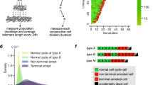 The proliferative capacity of individual TetO2-TLC1 cell lineages observed here is lower than that measured in bulk populations of cells, which undergo 40–80 population doublings depending on the strain background and initial mean telomere length5,12,19. We hypothesized that this apparent discrepancy may be due to competition and selection bias intrinsic to bulk cultures (that is, fitter cells outgrow slow-growing or arrested cells), which is absent in our single-cell analyses. To test this, we performed an in silico competitive growth assay on the basis of the probability of death and cell-cycle duration extracted from all single-lineage data (Supplementary Fig. 3a,b). This simulation quantitatively recapitulated the growth curves observed experimentally in batch cultures of the same strain (Supplementary Fig. 3c), confirming that the larger number of doublings before senescence observed in population growth assays was a consequence of the selection of fit cells.