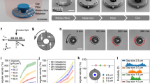 The fabrication starts with the spin-coating and baking (200 °C) of LOR3B/SU-8 (200 nm/4 μm on a silicon wafer). An amorphous carbon film (100 nm) is then deposited on the SU-8 by sputtering. Subsequently, LOR3B/S1813 (200 nm/1.5 μm) is spin-coated on the carbon layer, and laser lithography is performed to obtain the negative pattern of the microgears in the LOR3B/S1813 bilayer. After the evaporation of 100 nm chrome, the LOR3B/S1813 bilayer is removed by N-methyl-2-pyrrolidone, leaving chrome microgears on the carbon layer. The SU-8/carbon layer is then etched by reactive-ion etching in oxygen plasma; the chrome microgears act as etching mask and transfer their shape onto the SU-8; the etching process is anisotropic and produces SU-8 vertical walls. A finalized SU-8 microgear is depicted in Fig. 1a after chrome removal in chrome-etch solution. The microgears are finally released from the wafer by PG remover, which dissolves the sacrificial LOR3B layer at the bottom of the microgears (see Supplementary Figs 1 and 2 and Supplementary Methods for a detailed scheme of microfabrication).