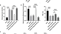 Mouse experiments are reported in accordance with the Animal Research Report of In Vivo Experiments (ARRIVE) guidelines. Experiments were performed in accordance with the Animal (Scientific Procedures) Act (UK) 1986 prepared by the Institute of Laboratory Animal Resources and under the auspices of UK Home Office Project and Personal License. Experiments were approved by the University of Bristol Ethical Review Committee. Six- to seven-week-old-male p75KO (ref. 60; genetic background: C57BL/6J) and WT littermates or CD-1 mice were made diabetic using streptozotocin (STZ; Sigma)3 or left normoglycemic after STZ buffer administration alone. STZ was delivered intraperitoneally (i.p.) for five consecutive days (40 mg kg−1 in citrate buffer per day). Fourteen days after the first STZ injection, glycaemia at fast and glycosuria were measured and only those mice with glycaemia above 200 mg dl−1 and overt glycosuria entered the protocol. Absence of hyperglycaemia and glycosuria in buffer-injected non-diabetic mice was also verified.