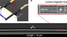 We carried out the magnetic contrast observation by using the Lorentz TEM (JEOL-2100F). In Lorentz TEM mode, the objective lens was turned off and an objective mini-lens under the specimen was employed to induce the normal magnetic field to the thin nanostripe. The observed magnetic contrast can be understood qualitatively in terms of the Lorentz force acting on the moving electrons as they travel through in the magnetic foil. The high-resolution lateral magnetization distribution map was obtained by TIE analyses of the Lorentz TEM images. The details of the Lorentz TEM and the TIE analyses are given in the Supplementary Note 1. The magnetization distribution maps used in the main text and Supplementary Information are all original ones without subtracting the artificial magnetic contrasts. Thin-plate thickness was measured using Electron Energy Loss Spectroscopy (EELS). A double-tilt liquid-nitrogen cooling holder (Gatan, Cryo-Transfer Holder) was used to detect the phase transition below the Curie transition temperature Tc. This enables the specimen temperature to be reduced to 100 K with the measured temperature displayed on the cooling holder controller. The magnetic field applied normal to the thin plate was induced by the magnetic objective lens of the TEM.