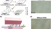 A piece of Au foil (99.95 wt%, 25–100-μm thick) was finely polished and annealed at 1,040 °C for over 10 h before the first use, and the polished face was placed face-down above a small quartz boat containing 200 mg WO3 powder (99.998 wt%) in the heating zone of a 1-inch horizontal tube furnace. Another small quartz boat containing 100 mg S powder (99.9995, wt%) was placed upstream outside the furnace, where the temperature was independently controlled (Supplementary Fig. 1). The Au foil was heated to 800 °C in an Ar atmosphere (200 s.c.c.m.) and annealed for 10 min to remove organics adsorbed on its surface. The S powder was then heated to 200–240 °C to generate S vapour to initiate the growth of WS2. After CVD growth for a certain time (4 h for a millimetre-size single-crystal WS2 sample), the furnace was cooled to room temperature naturally. The Ar gas flow rate remained constant (10–500 s.c.c.m.) during the growth and cooling processes.