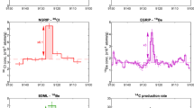 In addition to 10Be, we utilized the tree rings Δ14C data from Miyake et al.12,13 from which the production rates were derived in order to correct for post-production effects linked to the carbon cycle48. Radiocarbon content as retrieved from natural archives does not mirror the atmospheric production rate but rather a damped49 and time-shifted signal of it due the large active 14C reservoirs in the atmosphere, biosphere and ocean and their interactions. We therefore used a carbon cycle box-diffusion model50 to rectify this system bias and infer the 14C production signal which can explain the atmospheric 14C concentration, Δ14C (ref. 11). As the model returns normalized production rates, we multiplied the output results by 1.8 atoms cm−2 s−1. This corresponds to an average value of different suggestions for the mean global pre-industrial production rate of 14C ranging from 1.6 (ref. 51) to 2.02 atoms cm−2 s−1 (ref. 23). The applied carbon cycle model is not optimized for short timescales (that is, years). In consequence, it might not accurately reproduce the shape of the 14C increase. Nevertheless, the estimated peak amplitudes should be robust as the model reproduces the integrated longer-term atmospheric 14C signal. In comparison, our estimate for the 14C production rate induced by the AD 774/5 event (6.84 atoms cm−2 s−1) is very similar to the findings of Güttler et al.32 (6.9 atoms cm−2 s−1).